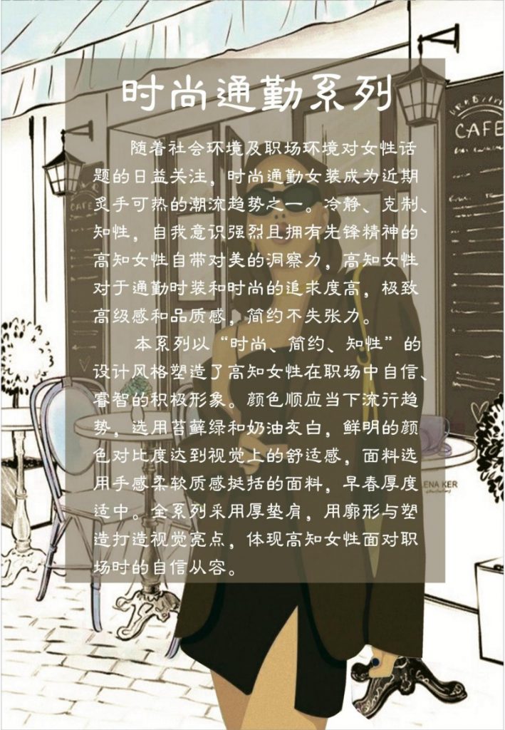 KT2301系列的设计灵感源自于都市女性的多面性——她们是职场上的精英,也是生活中的时尚达人。系列以“优雅的力量”为核心设计理念,通过精致的剪裁、高品质的面料选择以及细腻的细节处理,展现了女性既温柔又坚韧的独特气质。每一件单品都旨在提升穿着者的自信心,让她们在任何场合下都能游刃有余,展现最佳状态。